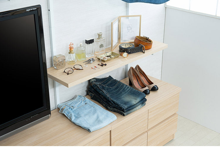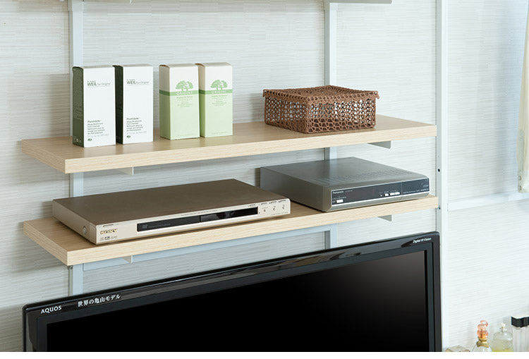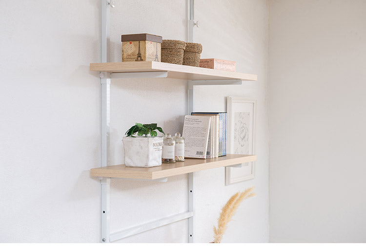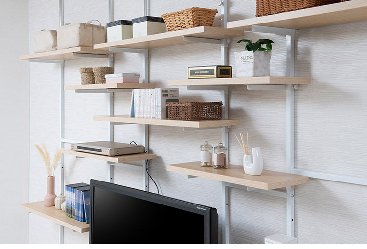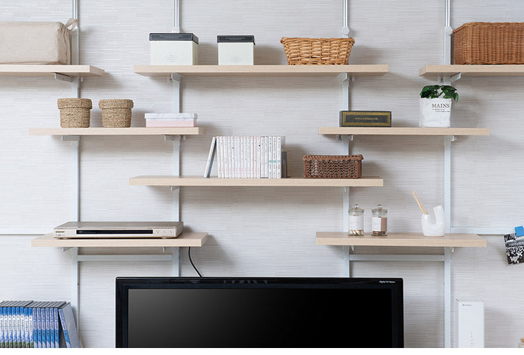 無段階に棚板の位置を調節できる突っ張りウォールシェルフ。棚板の位置を無段階に調節できるから自分の丁度いい高さにすることができます。