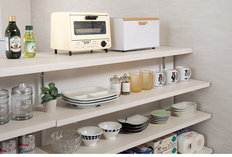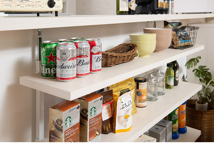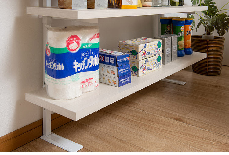 カウンター下のデッドスペースをオープンラックで収納スペースを作るウォールラック。突っ張り式の薄型省スペース設計で左右側板レスという圧迫感のないすっきり仕上げ。