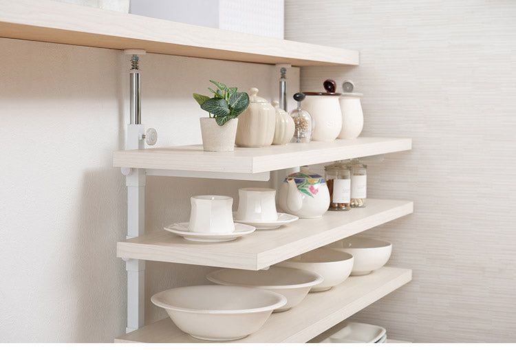 無段階に可変する棚板で、様々な物を、様々な用途で使う事ができる、万能型の突っ張り式のラックでお洒落なスペースに。棚板はつまみを緩めて移動が簡単にでき、無段階の高さ調節ができるので置くものに合わせてレイアウトができます。本体を2台並べて、別売り棚板を挟めば、用途がさらに広がります。置くものを変えても棚板を移動して模様替えが簡単にできるのが大変便利です。