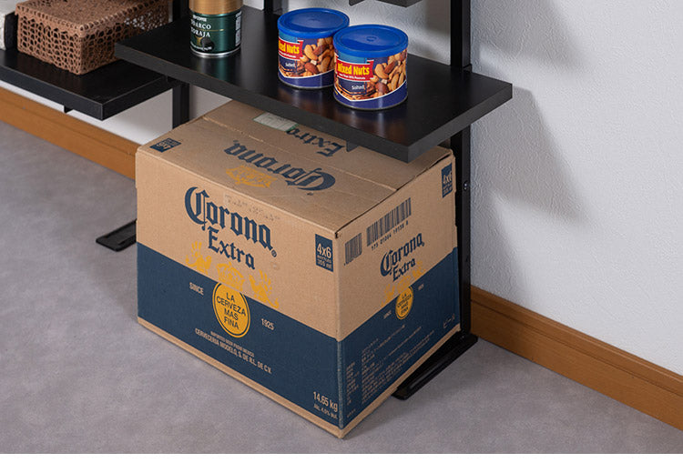 カウンター下のデッドスペースをオープンラックで収納スペースを作るウォールラック。突っ張り式の薄型省スペース設計で左右側板レスという圧迫感のないすっきり仕上げ。