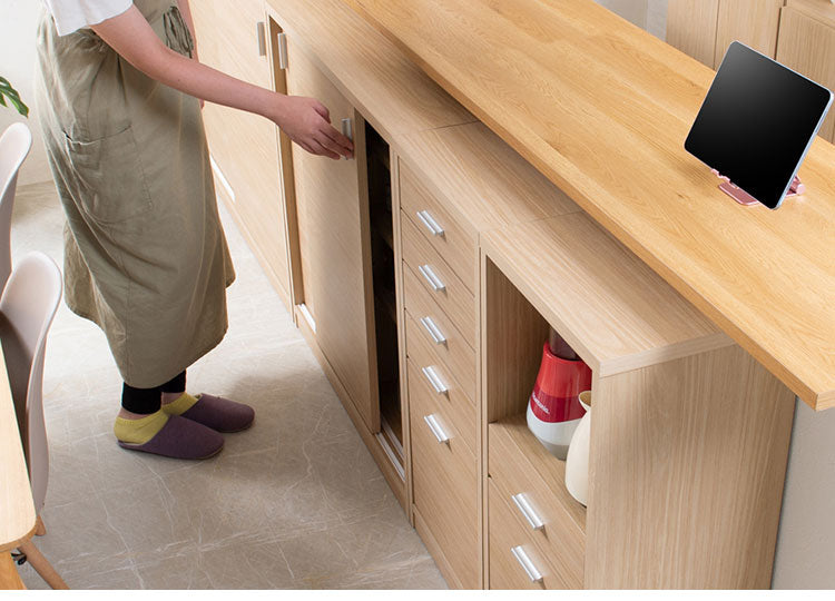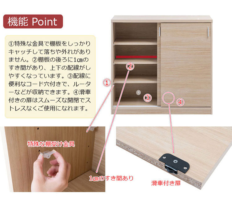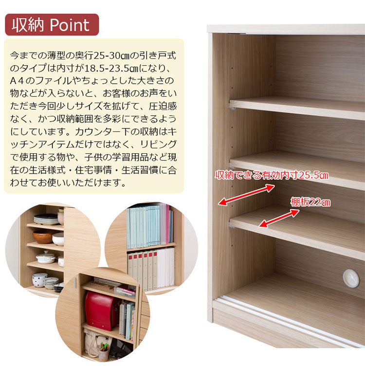 アイテムも豊富でカウンター下のデッドスペースを有効活用でき造り付けのような仕上がりです。開き扉の商品では、開閉のためにスペースが扉の幅分必要になってきますが、引き戸式ならわずかなスペースでOK。可動棚板の後部に1cmのすき間があり、上下の配線がしやすくなっています。配線に便利なコード穴付きで、ルーターなども収納できます。滑車付きの扉はスムーズな開閉でストレスなくご使用になれます。日本製&組立不要のすぐに使える完成品でお届け。