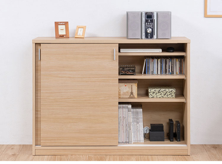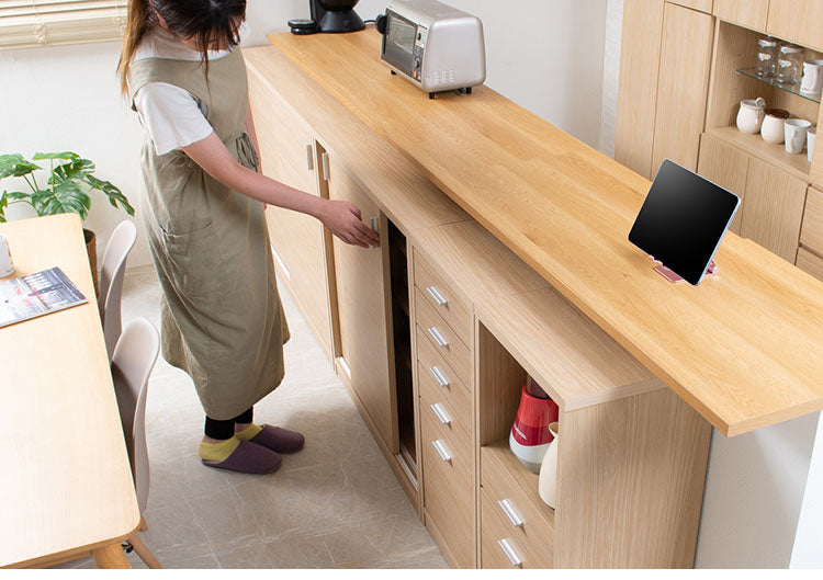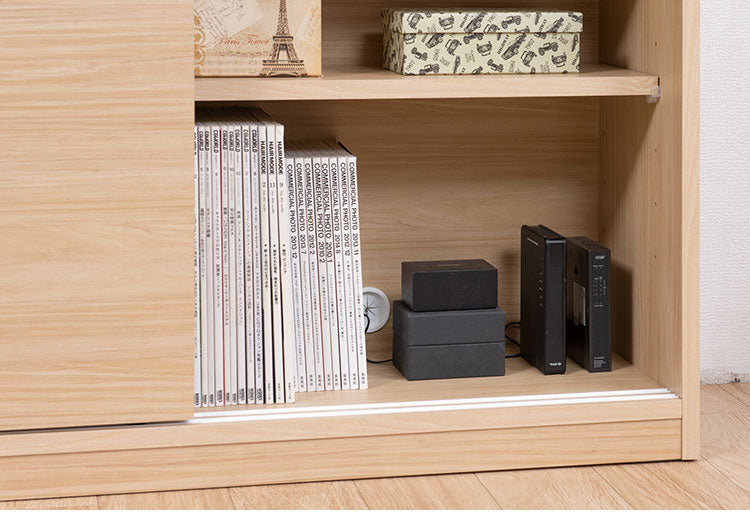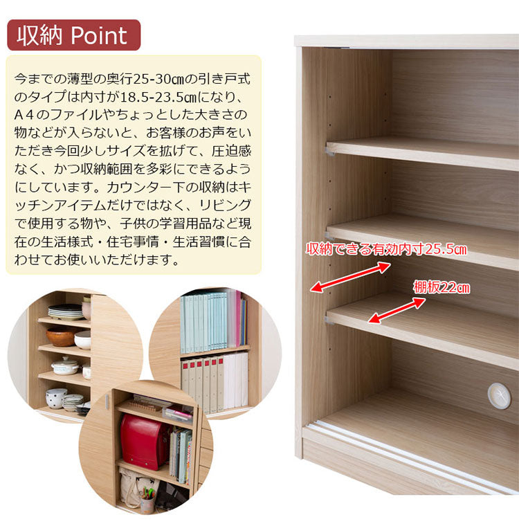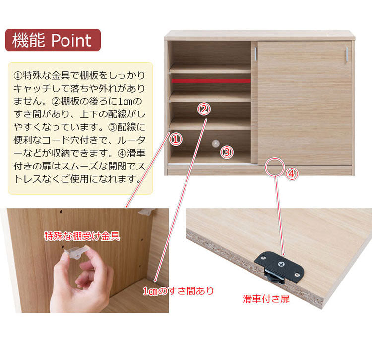 アイテムも豊富でカウンター下のデッドスペースを有効活用でき造り付けのような仕上がりです。開き扉の商品では、開閉のためにスペースが扉の幅分必要になってきますが、引き戸式ならわずかなスペースでOK。可動棚板の後部に1cmのすき間があり、上下の配線がしやすくなっています。配線に便利なコード穴付きで、ルーターなども収納できます。滑車付きの扉はスムーズな開閉でストレスなくご使用になれます。日本製&組立不要のすぐに使える完成品でお届け。