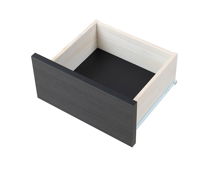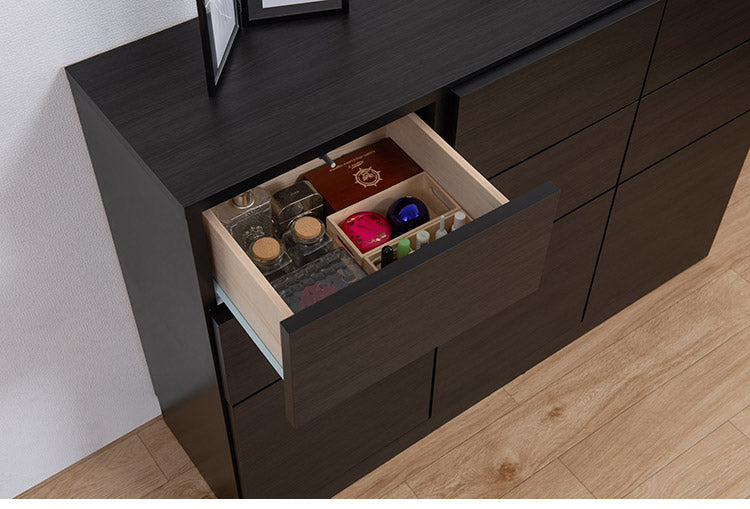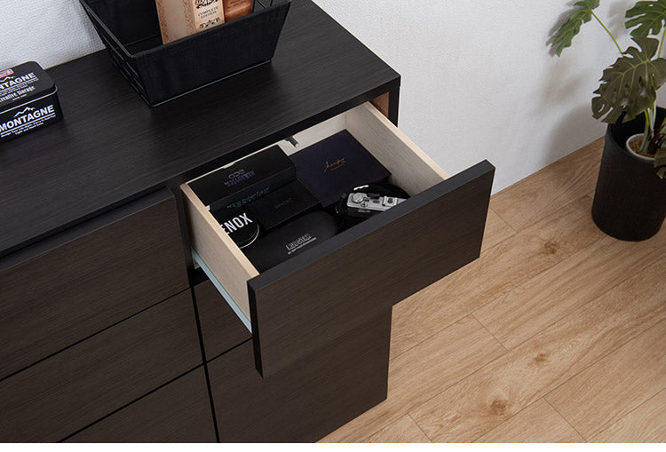 側板や内部に使用している木目のないスーパーブラックも傷がつきにくい強化紙を使用しています。本体のブラックと、天板と前板の木目の入ったブラックの絶妙な配色にこだわったデザイン。ブラックな木目が無機質なお部屋にプラス温かみを与えてくれます。6cmピッチで5段階移動ができる棚板は、キッチンやリビングで様々な使い方が可能。扉内はコード穴を設けて配線が必要な製品を使用される時に便利です。棚板を使用しても後ろに隙間を設けているので、扉内での配線もできるようになっています。扉と引出しには押して開けて、押して閉めるプッシュ式を採用。壁にぴったりと設置してもすき間ができないように背面に巾木よけカットを施しています。シンプルに仕上げて使い勝手もよく、便利な機能になっています。