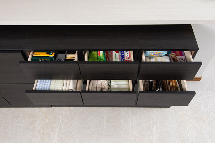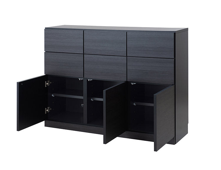 オールブラックで仕上げた薄型カウンター下収納シリーズは風格のある存在感。傷がつきにくい強化プリント紙を使用した、木目の入ったブラックは高級感があり、お部屋をシックに演出します。