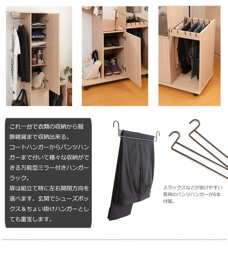 キャスター付きで移動もラクラクな上、衣類も扉付きラックで隠せる収納として、コートなどはハンガーへ、更にスラックスなど掛けられるパンツハンガーまでついた完全無欠のオールインワンラック。