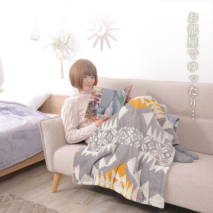 ボタンがついており着られるタイプの毛布。 ひざ掛けにも、ポンチョにも、肩掛けにも。