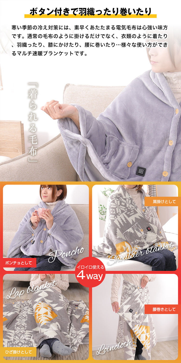 寒い季節の冷え対策には、素早くあたたまる電気毛布は心強い味方です。通常の毛布のように掛けるだけでなく、衣類のように着たり 、羽織ったり、顔にかけたり、腰に巻いたり・・・様々な使い方ができ るマルチ速暖ブランケットです。