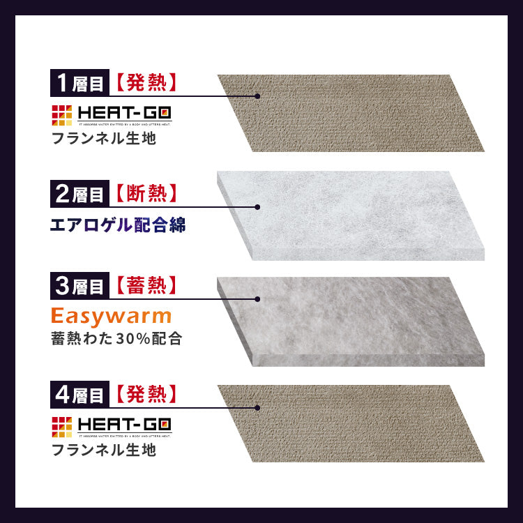 側生地に吸湿発熱生地のHEAT-GOフランネル生地を使用して保温力が格段UP。