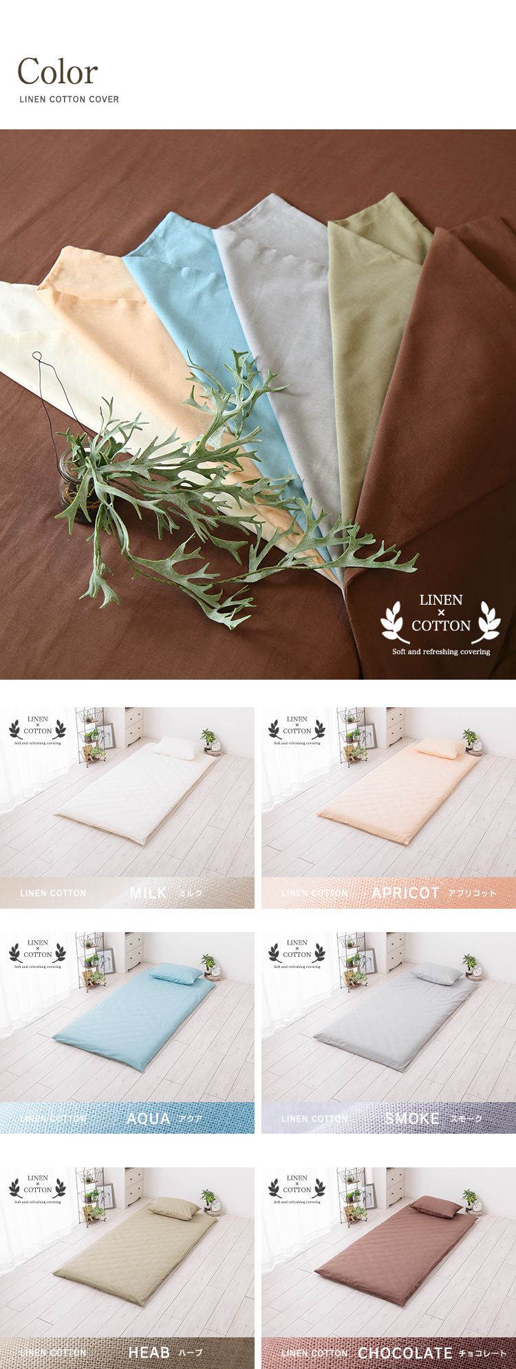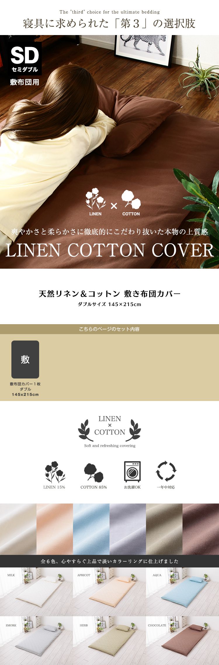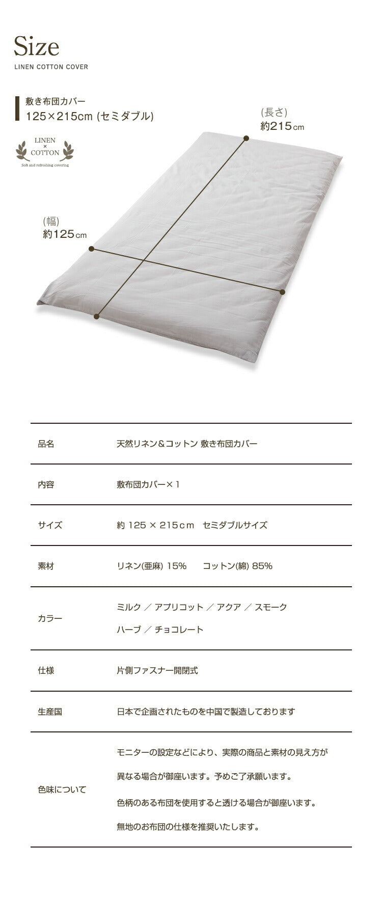 天然リネン&コットン 敷き布団カバー セミダブル 125×215 おしゃれ 北欧 麻混 綿 コットン 敷布団カバー ふとん 敷き布団 カバー 洗濯可能 ウォッシャブル 6色展開 一人暮らし 新生活(代引不可)