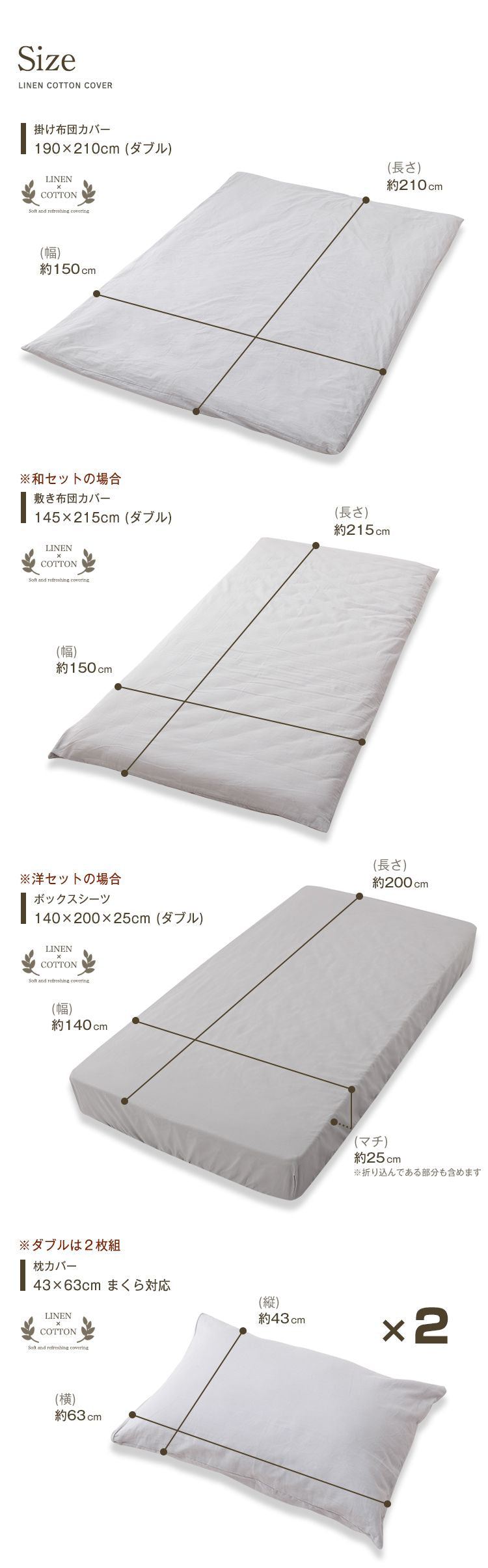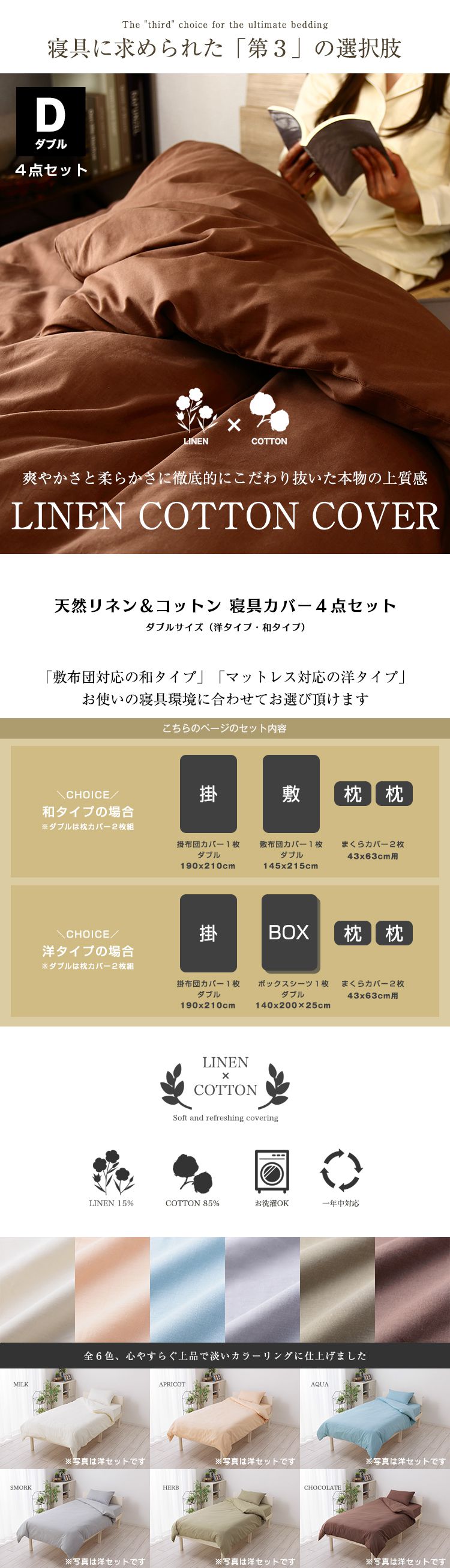 天然リネン&コットン 布団カバー4点セット ダブル 和タイプ 洋タイプ おしゃれ 北欧 麻混 綿 コットン 敷布団カバー 枕カバー 2枚セット 洗濯可能 ウォッシャブル 6色展開 一人暮らし 新生活(代引不可)