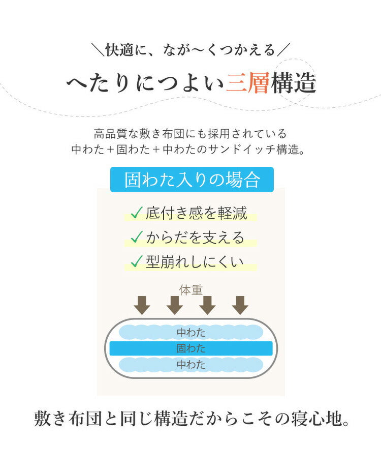 固わた三層構造:しっかりとした「固綿」を中綿で挟むことで底付き感を軽減し、へたりにくくしっかりとした寝心地を実現しました。