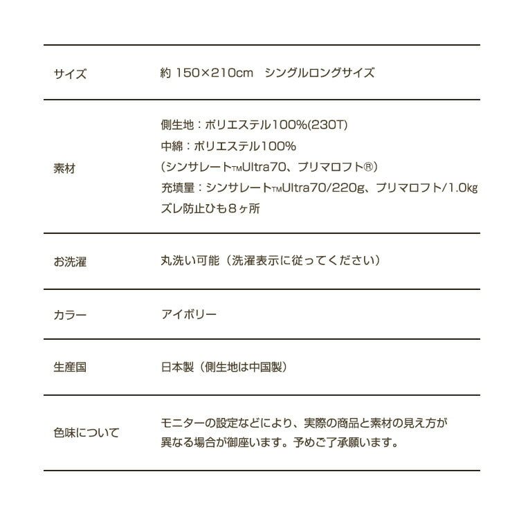 日本製 シンサレート×プリマロフト 人工羽毛布団 掛け布団 シングル ロング 国産 抗菌防臭 洗える 掛布団 冬用掛け布団 防ダニ thinsulate シンサレート ウルトラ 冬 節電 寝具 暖かい