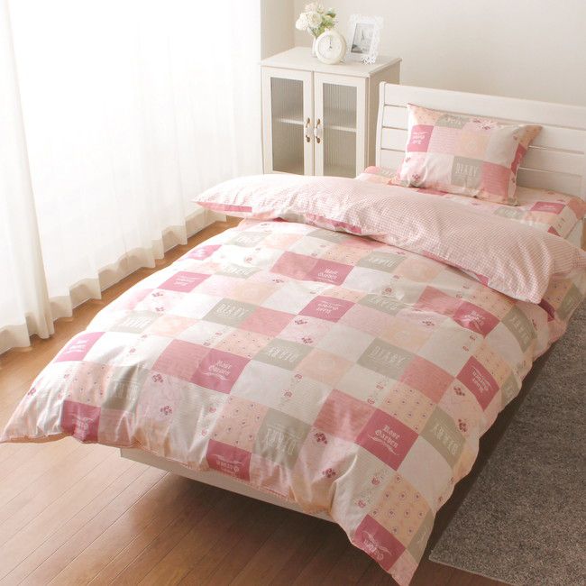 素材:綿100% 表プリント、裏ギンガムチェック 210cmファスナー 8か所ヒモ付き アンティーク感漂う英文字やフラワーモチーフなど上品でクラシカルなデザインをパッチワーク風に仕上げました。裏面にはギンガムチェックをコーディネート