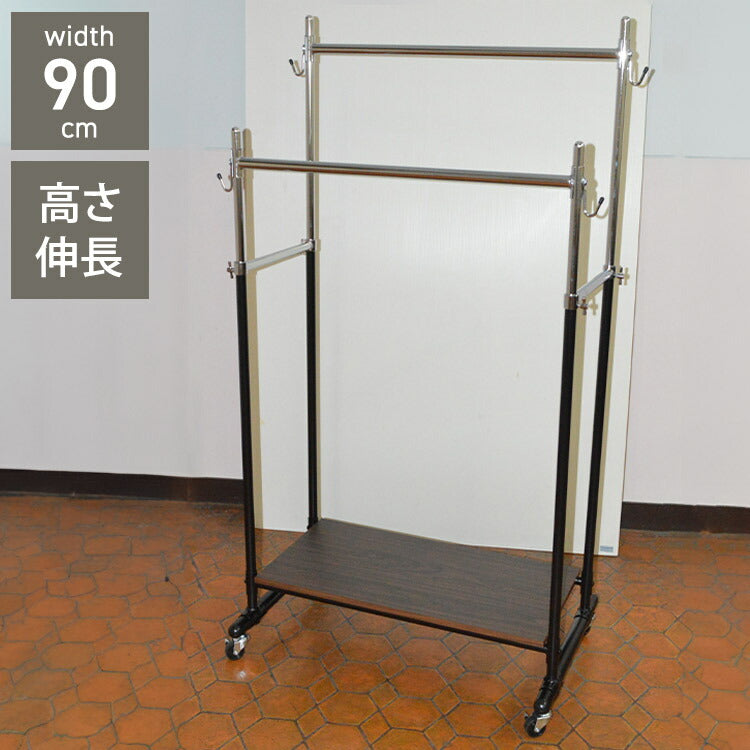 頑丈ハンガーラック 幅90cm ダブル キャスター付き 下棚収納 高さ伸長可 スチール製 ハンガー 衣類収納 コート掛け パイプハンガー(代引不可)