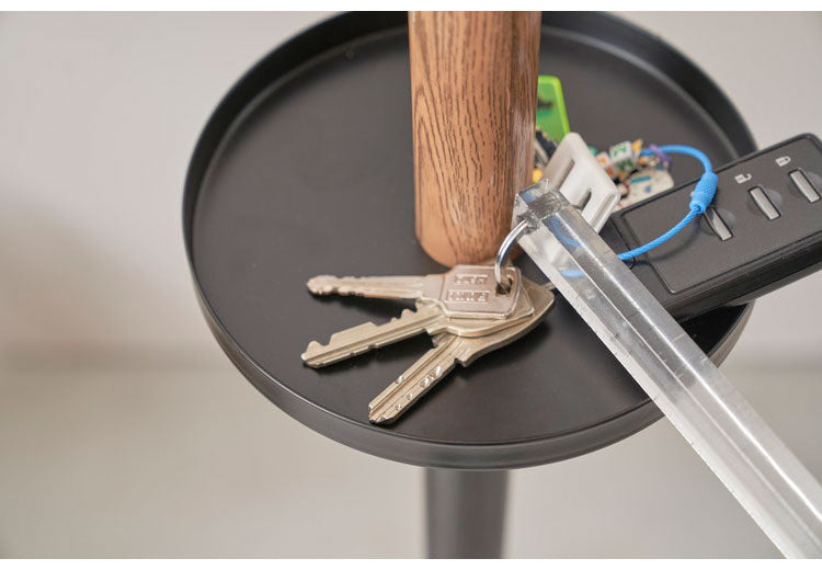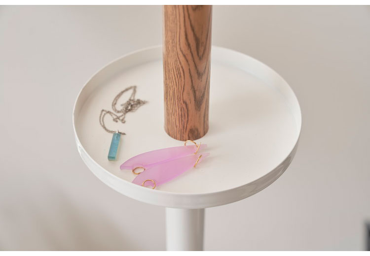 上部分はフック6本取り付けてあり、中間部分はかわいらしいお皿のような小物置きがあり、鍵や腕時計・ピアスなどを置けます。
