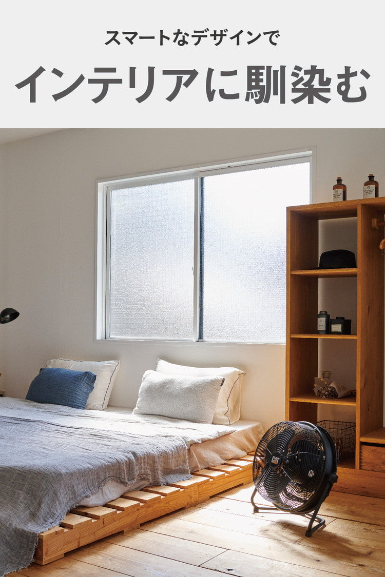 本体が動かず羽根軸が回転し広範囲に風を送ります。真上にも真下にも向けられ床置き・壁掛けも可能。薄い形状で狭いスペースに設置ができて倒れにくいです。高耐久なアルミ羽:日光・高周波設備による共振破壊・油分などによる劣化はしません。コードをしまえるリール付。スタンドのみ組立・保証書付