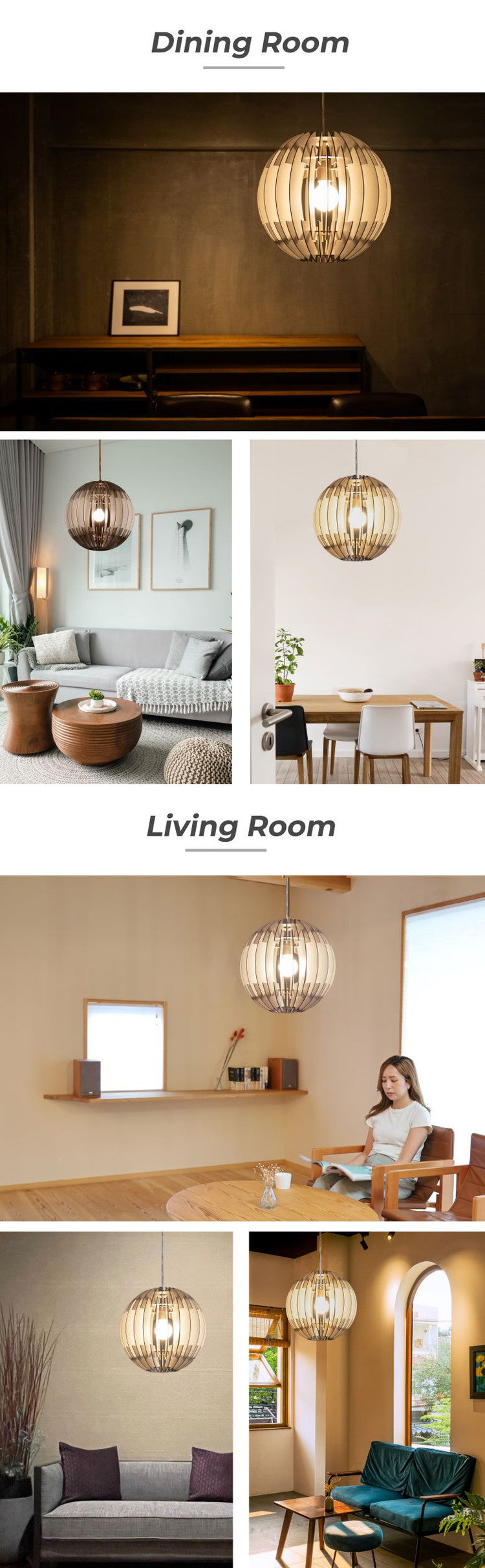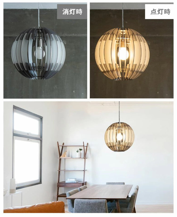 たくさんの木の羽根でつくられた球体はどこか宇宙的。落ち着いたグレーとホワイトのひとつひとつの羽根のあいだから放たれる光のアングルが、見たことのない美しい空間をリビングに作りだします。