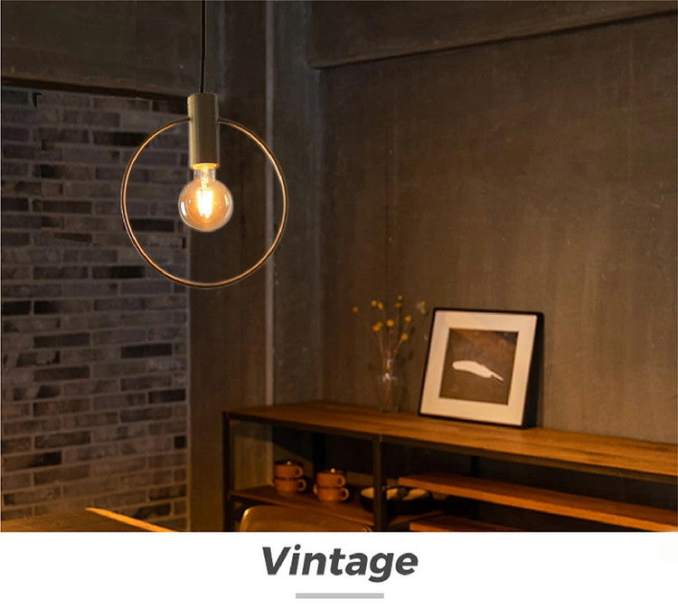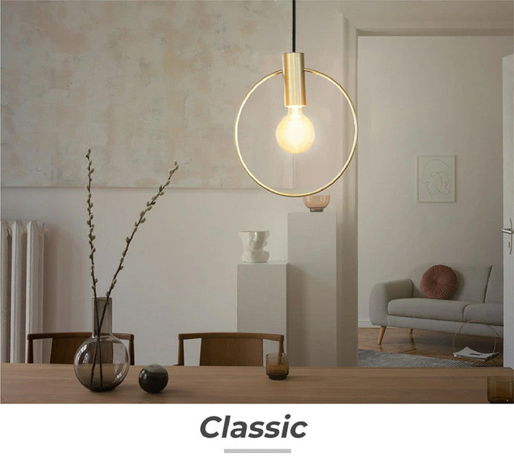 ランプソケットを吊り下げただけのシンプルなスタイルに、円形の装飾リングをプラスした、ミニマルで優雅なペンダントライト。