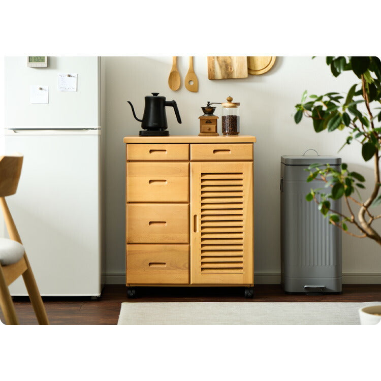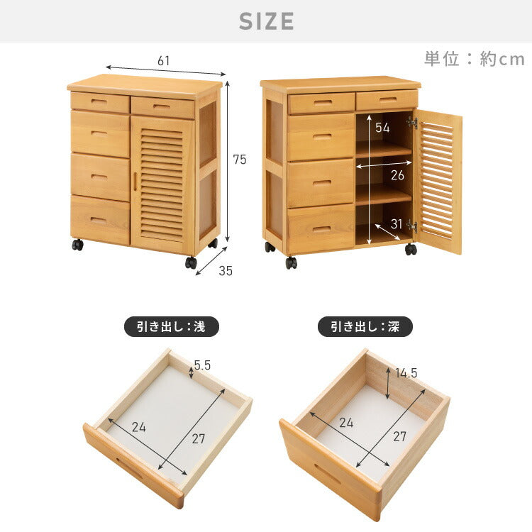 キッチンワゴン 完成品 幅61cm キャスター付き 天然木 ルーバーキッチンワゴン 大容量 引出し収納 扉収納 キッチンカウンター キャビネット 棚 ラック ワゴン 作業台 木製 ルーバー扉(代引不可)