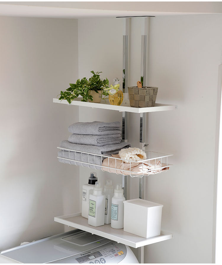 突っ張り ランドリーラック 幅58cm ロータイプ 高さ145~208cm 棚2枚+バスケット1個 防水パン対応 棚板リバーシブル 突っ張り つっぱり ランドリー 洗濯機ラック 棚 ラック ランドリー収納(代引不可)