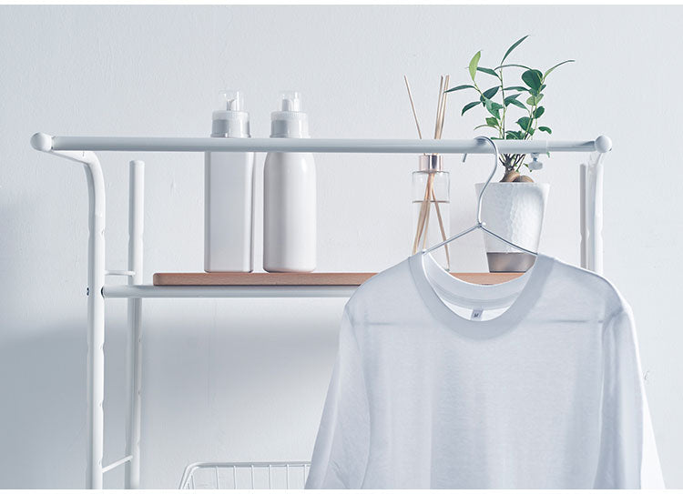 洗濯物の持ち運びにも便利な持ち手付きのカゴがセットのランドリーラックです。