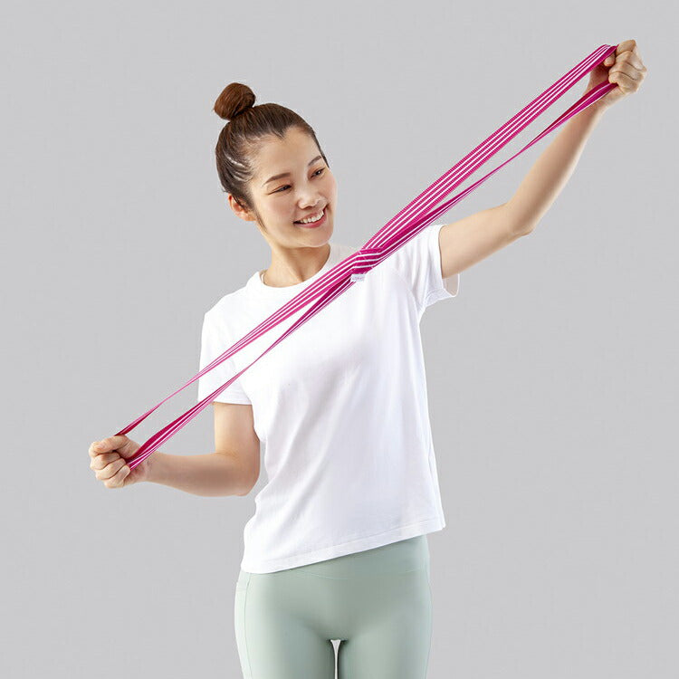 たすき掛けに着用するだけで簡単に肩まわりがストレッチできる肩甲骨バンド。ゆるく伸びるから締め付けすぎず、ラクに長時間「ながらストレッチ」ができます。
