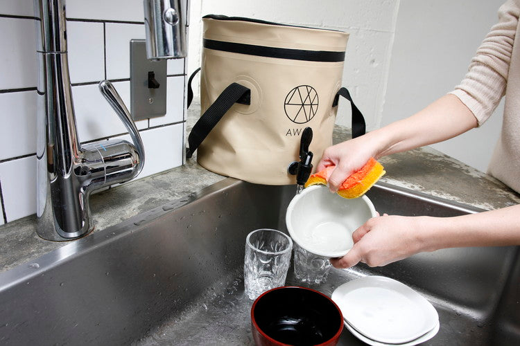 天面を閉じたまま水を補給することができ楽ちん。底面に持ち手が付いており、残った水を捨てる時などひっくり返すときに便利。洗った後、逆さまにして吊るして干すこともでき衛生的。片手で簡単に開閉できるワンタッチ式コック付きで、両手が空くので洗いやすい。キャンプはもちろん、災害時にも手や食器などを洗う際に便利。
