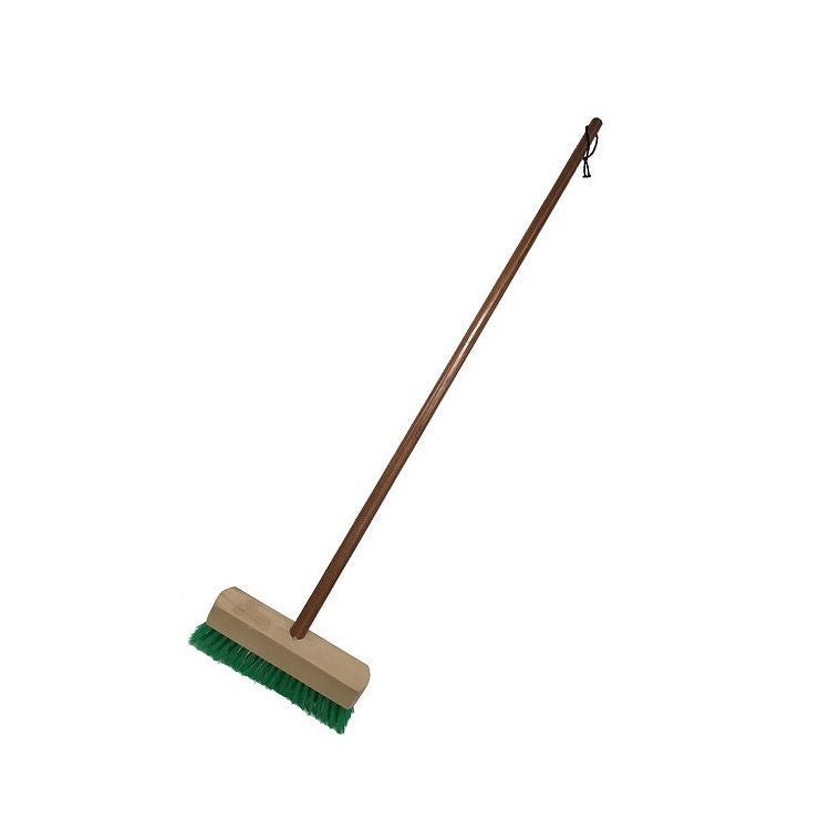床洗浄に最適木製の柄がついたデッキブラシです。