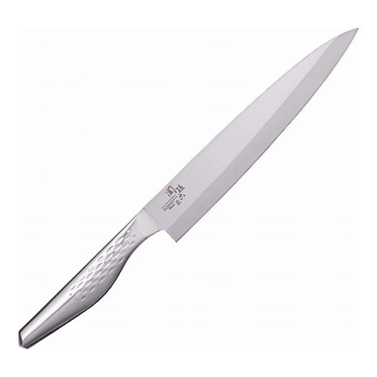 刃体からハンドルまで継ぎ目がなく、衛生的に使えるオールステンレス刺身包丁。刀鍛冶「関孫六」の名を冠した包丁シリーズ。裏スキ加工を施すことで刃体が薄くなり、爽快な切れ味を実現。