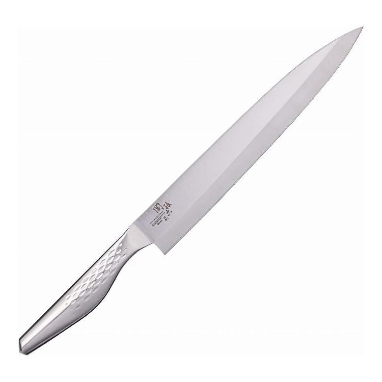 刃体からハンドルまで継ぎ目がなく、衛生的に使えるオールステンレス刺身包丁。刀鍛冶「関孫六」の名を冠した包丁シリーズ。裏スキ加工を施すことで刃体が薄くなり、爽快な切れ味を実現。