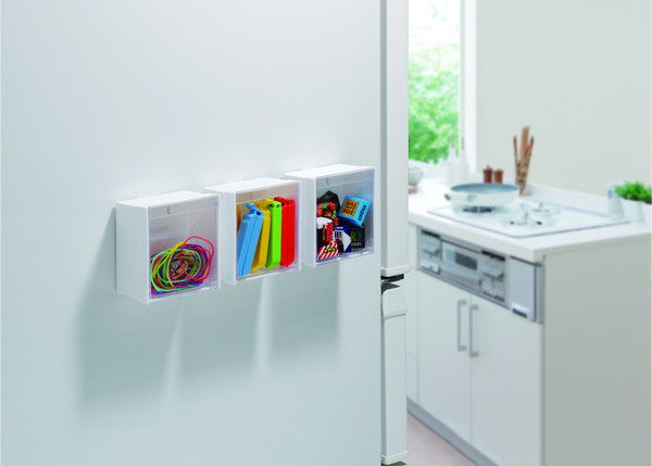 マグネットで壁面にくっつけたまま小物を出し入れできる蓋付き収納ケース。