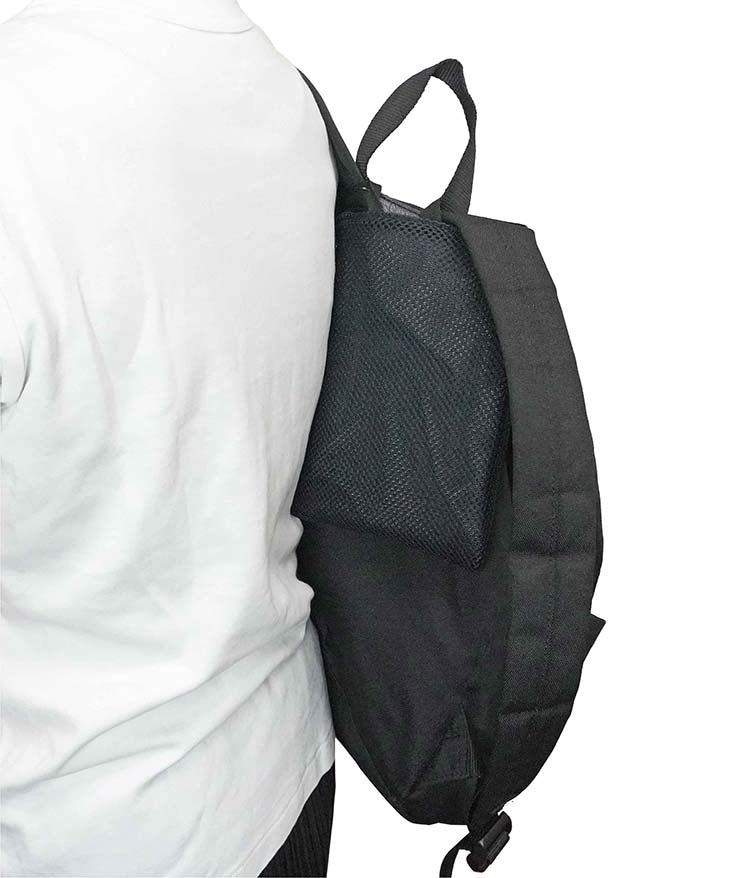 夏の外出時の背中の熱ごもりと汗を軽減するための、リュック装着型の保冷剤ケース。市販の保冷剤を入れてリュックに取り付けて使用する。