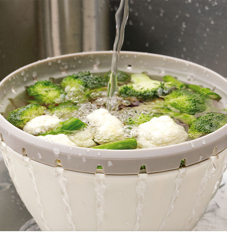電子レンジ・食洗機で使えるフタ・ザル・ボウルのセット。食材のあふれを防ぐ流水穴付き。