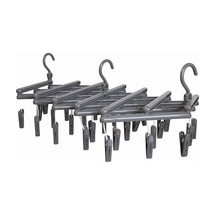 蛇腹式で伸縮するピンチ付き角ハンガー。洗濯物を干したり、取り込む際の作業に合わせて、また、干し場のスペースに応じて幅を調整しながら使用できる。