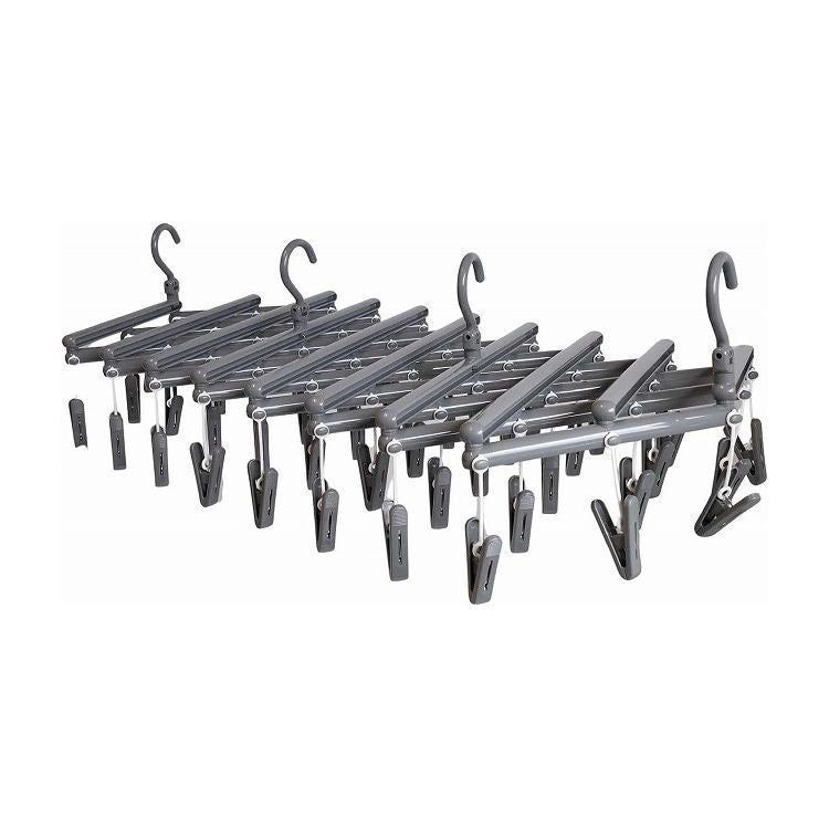 蛇腹式で伸縮するピンチ付き角ハンガー。洗濯物を干したり、取り込む際の作業に合わせて、また、干し場のスペースに応じて幅を調整しながら使用できる。