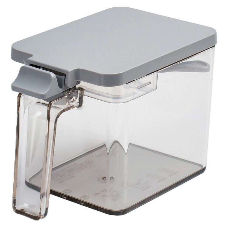 材質:本体・フタ/ポリスチレン すり切り板・スプーン/ポリプロピレン プッシュレバー/ABS樹脂 バネ・パッキン/シリコーンゴム