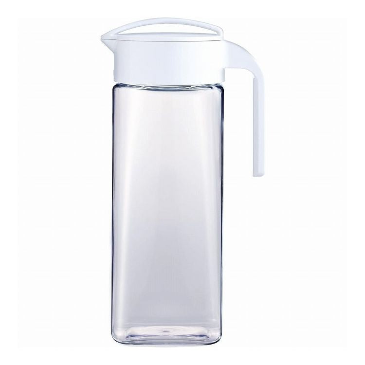 ハンドル付き麦茶ポット。冷蔵庫内のスペースを効率的に使える角型。奥行が2Lペットボトルと同等サイズで冷蔵庫ドアポケットに収納できる。