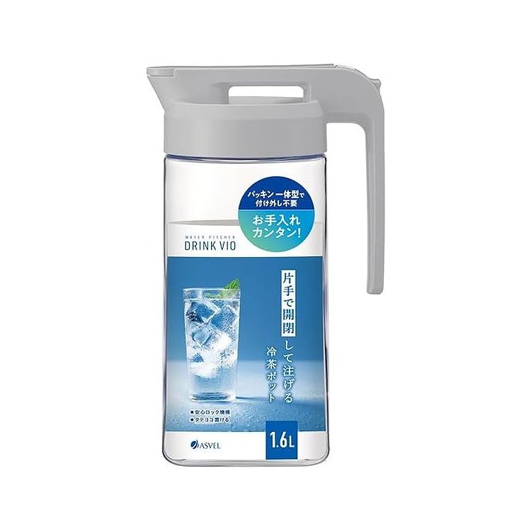 機能的なプラスチック製ジャグ。フタと一体のパッキンだから取り外しの必要なし。広口開口で洗いやすい。