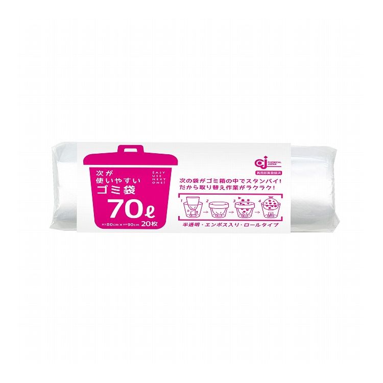 20枚分のゴミ袋がロール状になってつながっている、便利なポリ袋70L用。次に使う袋がゴミ箱の中に収納されたまま、ゴミ箱にかけて使用する袋で、取り替え時に新しいゴミ袋を用意しなくていい。