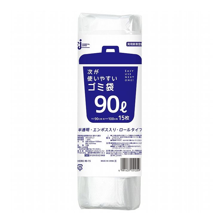 15枚分のゴミ袋がロール状になってつながっている、便利なポリ袋90L用。次に使う袋がゴミ箱の中に収納されたまま、ゴミ箱にかけて使用する袋で、取り替え時に新しいゴミ袋を用意しなくていい。