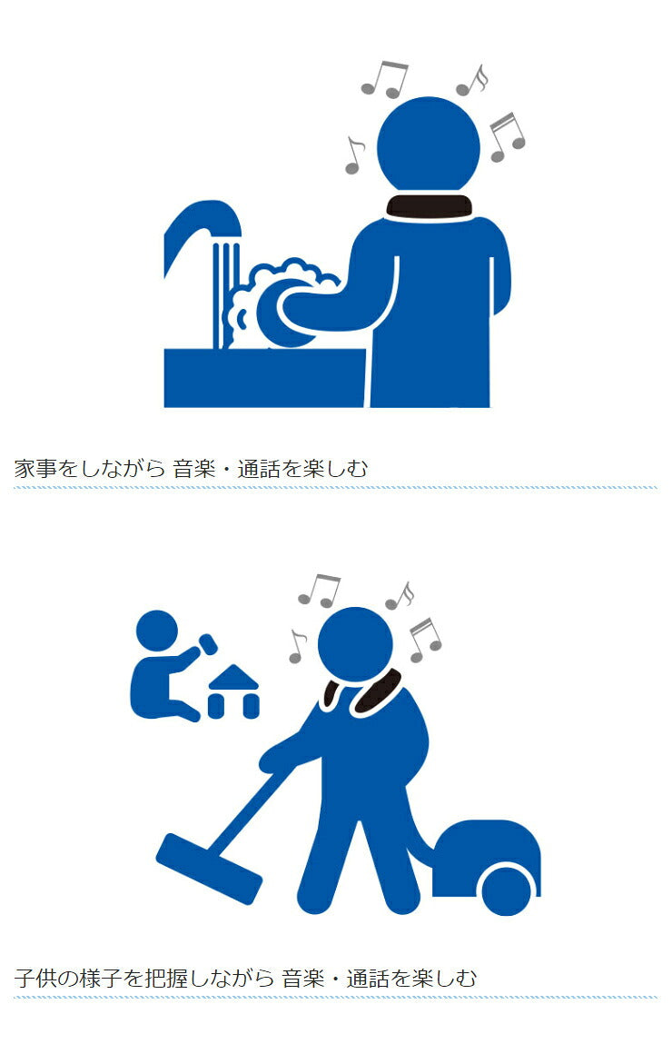 ◆ヘッドホンと違って周りの音も聞こえ、周囲の状況を把握しながら音楽・通話を楽しめる。