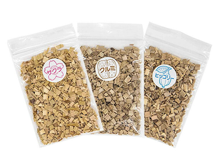 ・サクラ、クルミ、ヒッコリーの3種のスモークチップが付属します