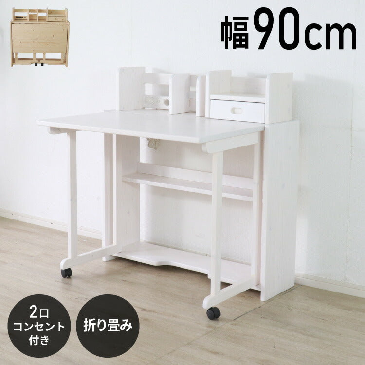 折りたたみ デスク 幅90cm 天然木 パイン材 シンプル コンパクト 収納 省スペース 子供部屋 子ども 学習デスク 勉強机 学習机 書斎 2口コンセント付き 新生活 一人暮らし(代引不可)