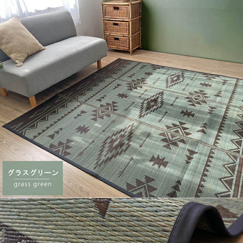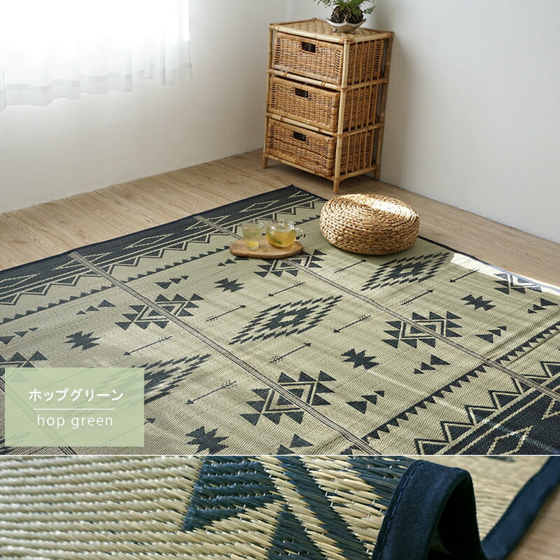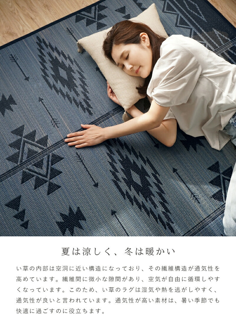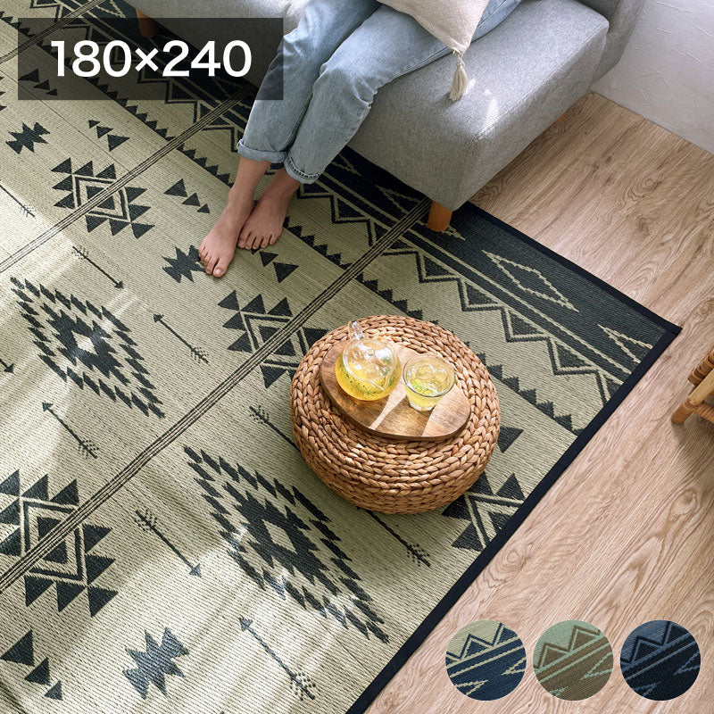 い草 ラグ 夏用 おしゃれ 涼しい 3畳 長方形 西海岸 インテリア 敷物 エスニック オルテガ キリム 180×240cm ネイビー グリーン 夏インテリア アジアン アウトドア 洗濯不要 洗わないラグ