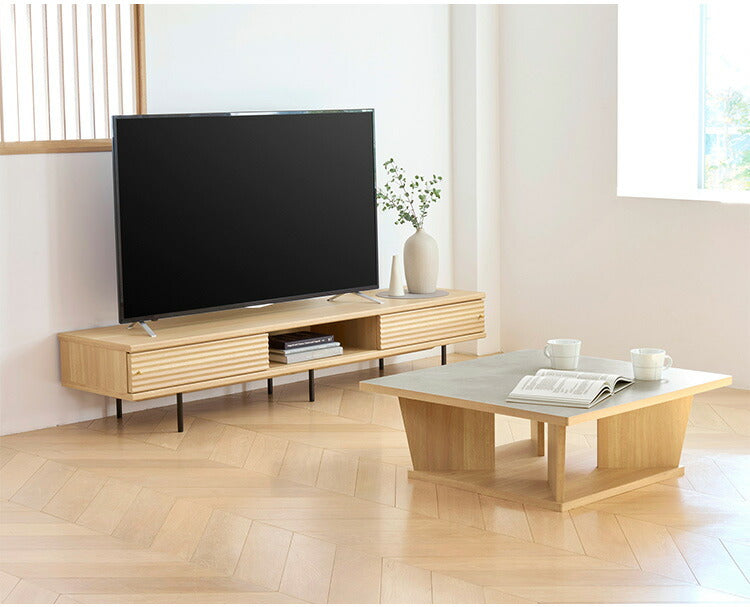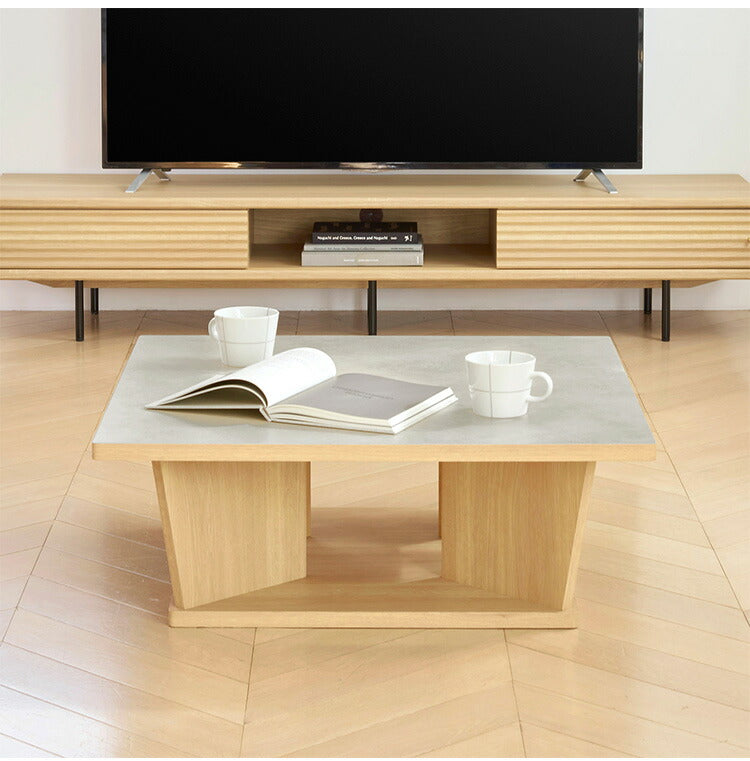 厚い天板を四方の角に向かう脚パネルで支えるデザインで和モダンを表現。洋の空間に自然に溶け込みます。