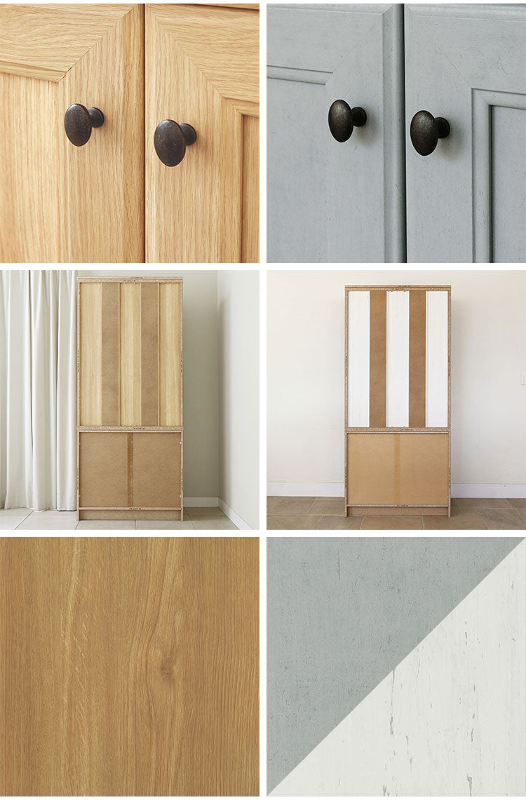 素材・加工:本体/プリント紙化粧繊維板、表面/プリント紙化粧繊維板、取っ手/亜鉛合金