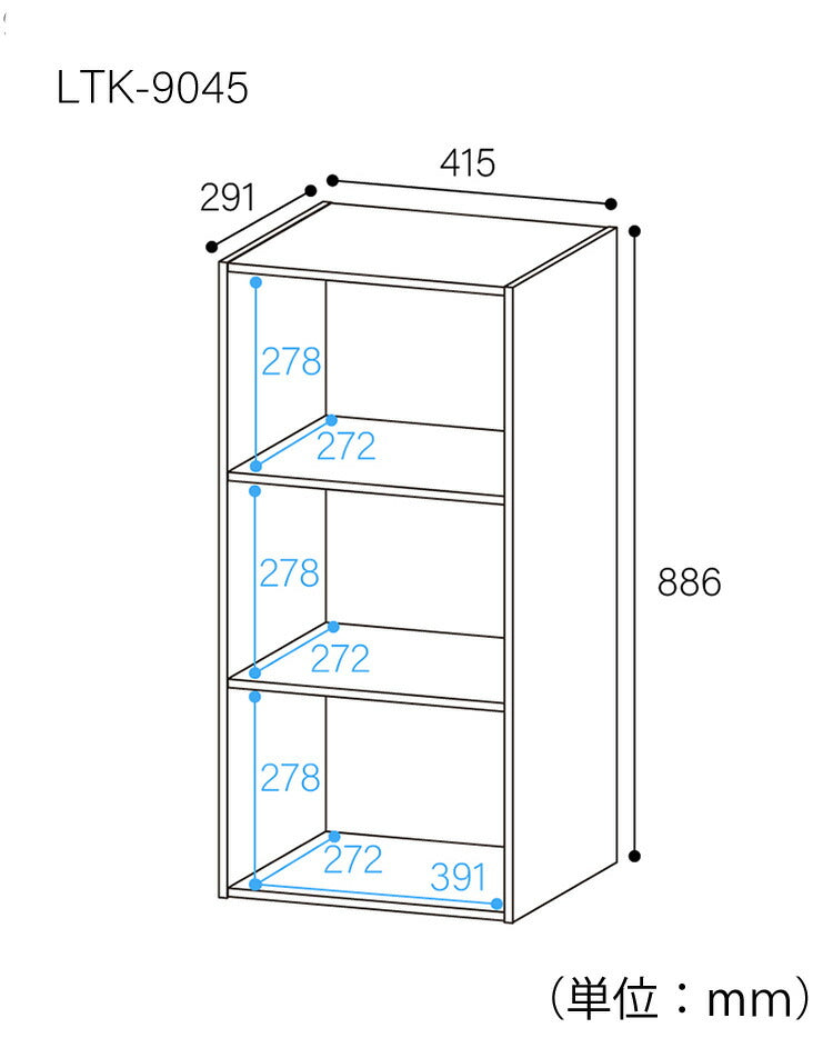 各棚の内寸幅39.1cm、高さ27.8cmで、カラーボックス対応の収納ボックスが入ります。収納ボックスを使えば細かい物もすっきり収納できます。