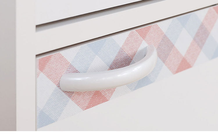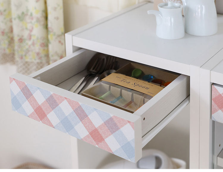 ・上部のチェック柄部分は引き出し収納。フォークやスプーンなどのカトラリーを収納できます。