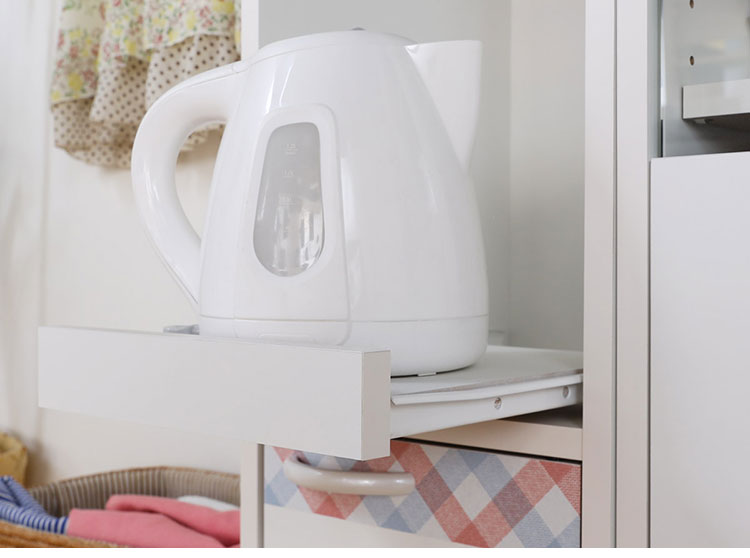 ・スムーズに動かせるスチール製スライドレールの棚付き。電気ポットなどの家電を収納するのに便利です。