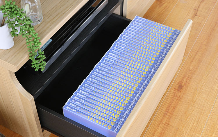 ・スチール製で丈夫なスライドレールの引き出しには、左右それぞれ34枚、計68枚のDVDが入ります。